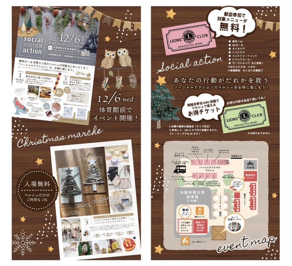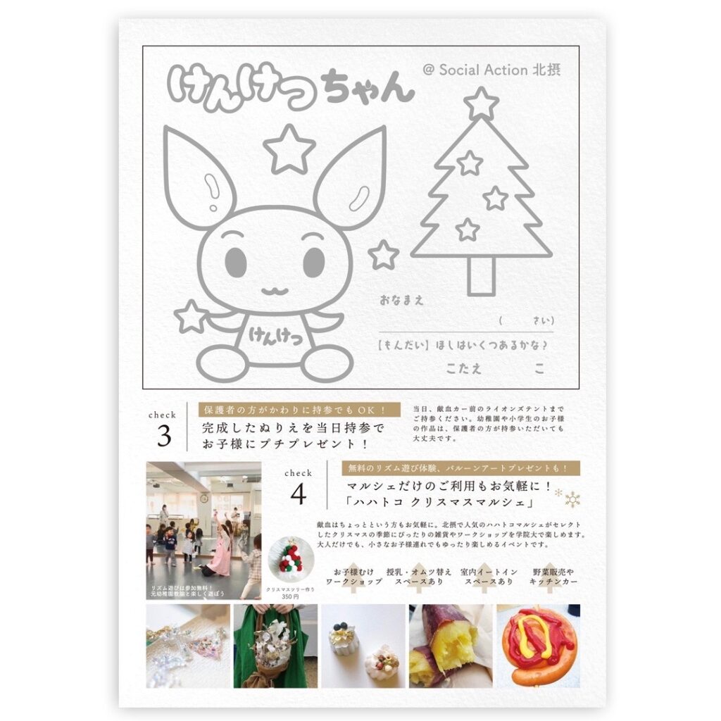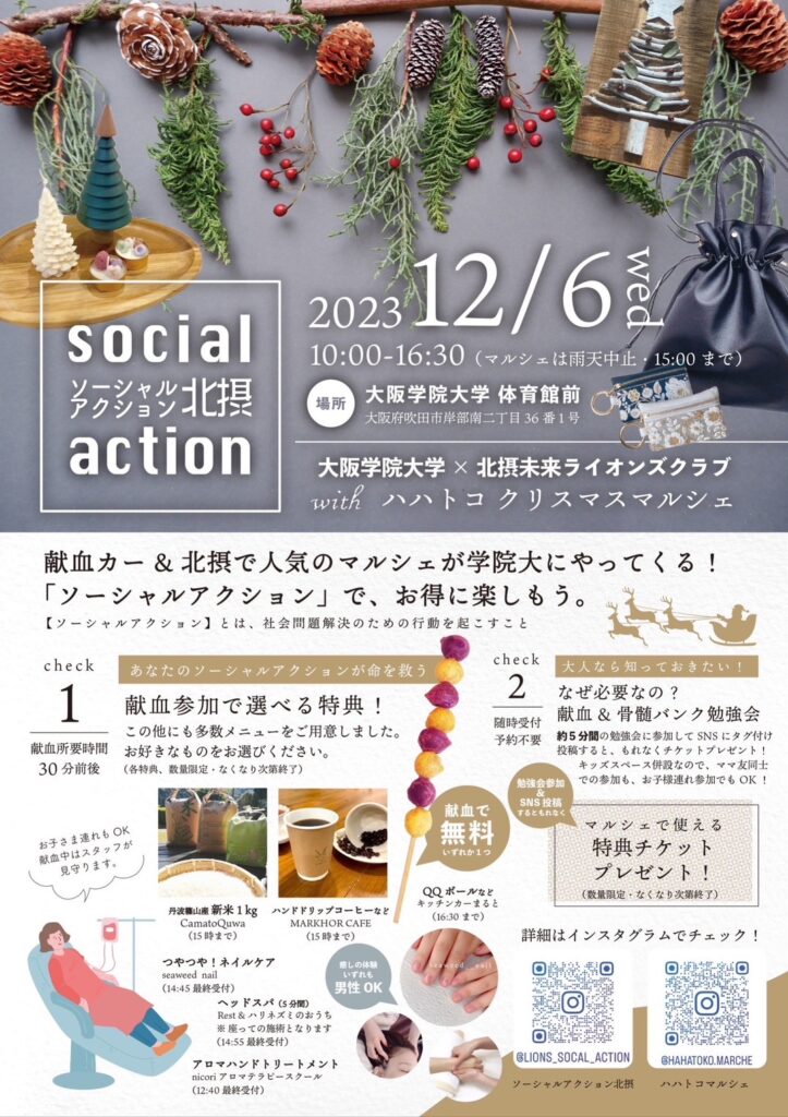 12月6日(水)は、「大阪学院大学との合同献血」に「地域の子育て世帯(乳幼児×ママ)に向けたアクティビティ」を加え、北摂で人気のマルシェにご参加いただき「ソーシャルアクション北摂Ⅲ~大阪学院大学献血×ハハトコクリスマスマルシェ~」として開催いたします。