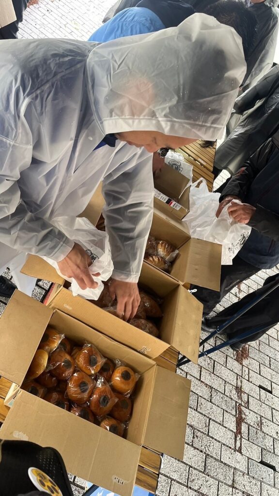 今回の+アルファ計画は地元飲食店の2店舗がご協力頂き、昨日に続き、輪島で有名なお寿司屋さん「伸福」さんの海鮮太巻き60食と、同じく地元で有名なこだわりパン屋さん「ラポール・デュパン」のパン100食を配り、実施しました。