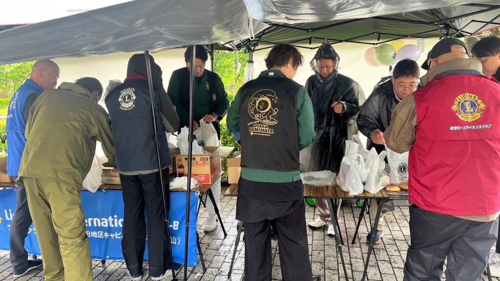 本日の「キッチンカーメニュー」は、スパイスカレー100食・ホットサンド100食・デザートのカステラボール125食とクレープ200食 計525食そして、昨日に引き続き大阪の551豚まんを吹田江坂LCのL黒岩、L下谷の協賛で、本日分500個、昨日とで合計1,000個配布いたしました。