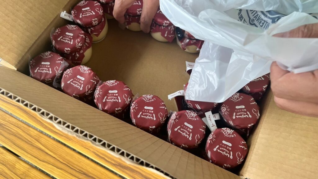 本日の+アルファ計画はお店の協力者が1件増えて、老舗和菓子屋さんの中浦屋が手がける地元で有名な「輪島プリン」を200個購入、継続支援の「ラポール・デュパン」のパン、「伸福」さんのお寿司、「やぶ新橋」さんのお弁当を地元の皆様にご提供しました。