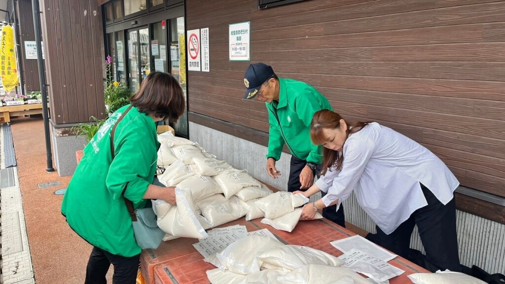 今回はJAにお勤めの方々へも豚まん、お米もご提供させて頂き、JAにこられた一般の方々や、併設されたスーパーにお買い物にこられた方々に上記の品々を配布させて頂きました。
